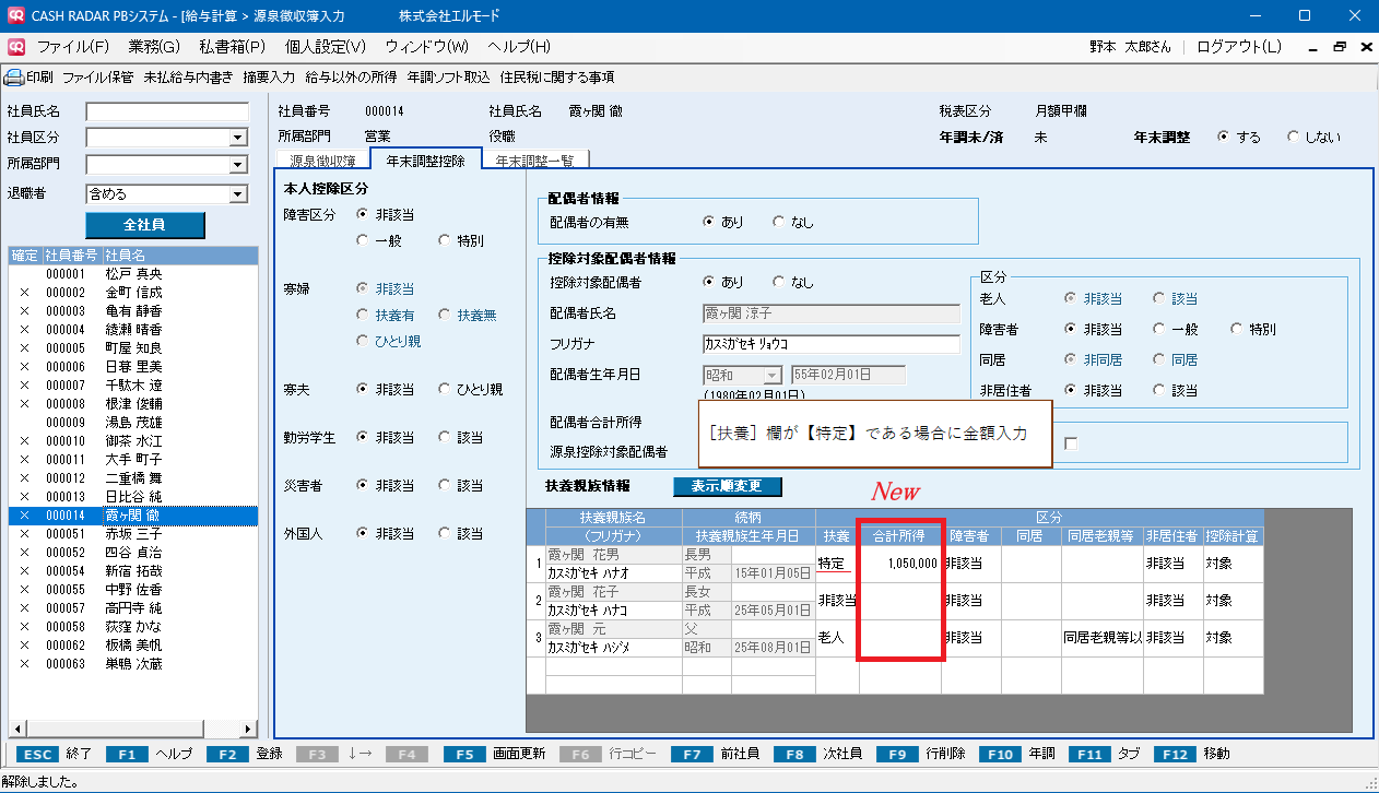 入力した金額に応じ、年末調整一覧タブにおいて特定親族特別控除額、あるいは特定扶養控除額が算出されます。