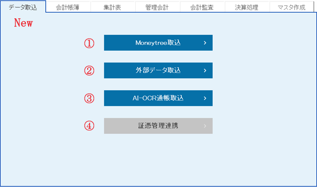 | ③ | AI-OCR通帳取込 | 本年12月リリースの新メニューです。 スキャナやカメラでPDF、JPEG等にファイル化した紙の通帳を「AI-OCR」で読み取り、仕訳として変換・取込を行うことができます。 |